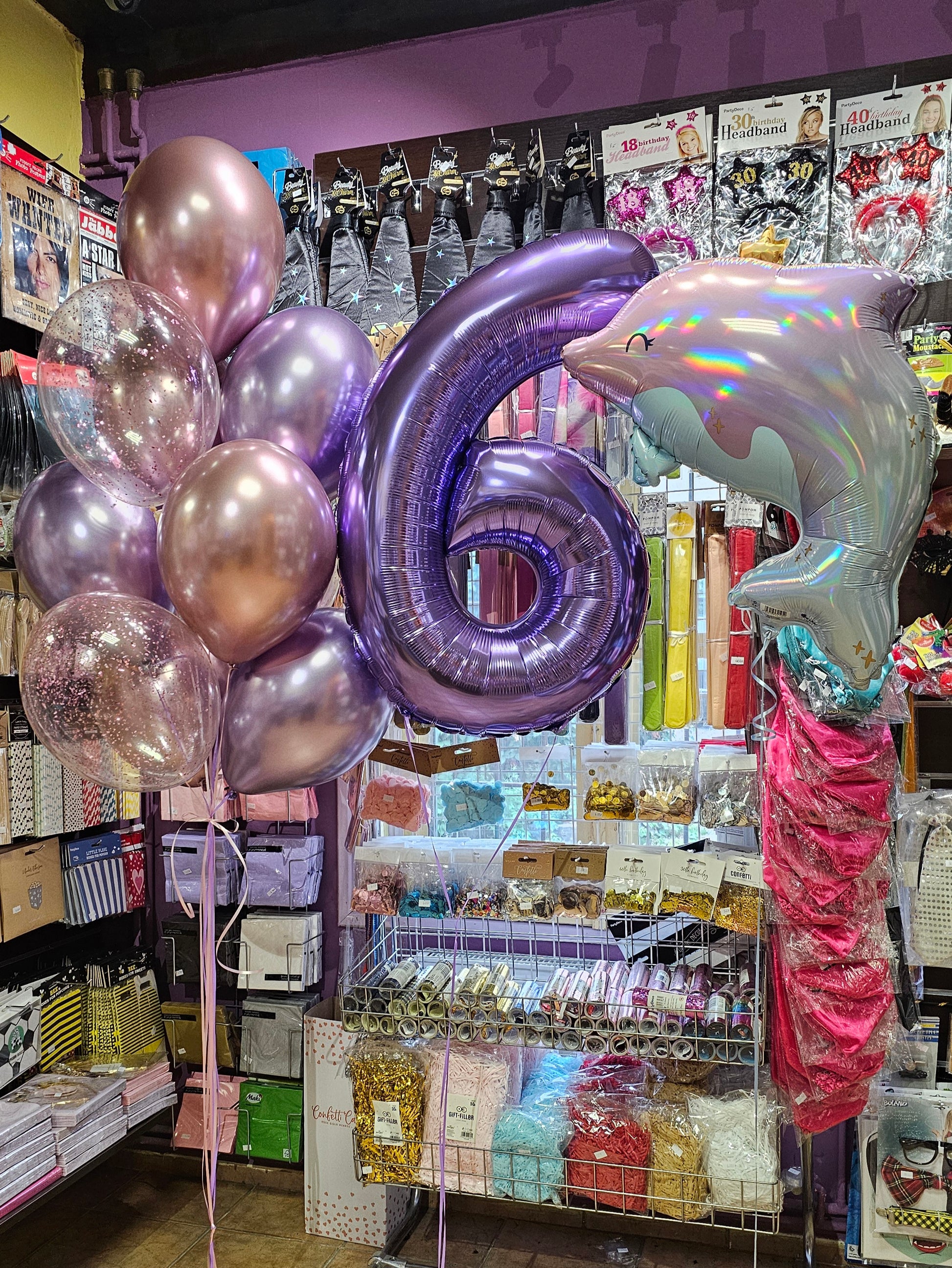 - bukiet z 10 balonów lateksowych: 3 balony chromowane różowe, 4 balony chromowane fioletowe, 3 balony transparentne z różowymi, błyszczącymi drobinkami.
