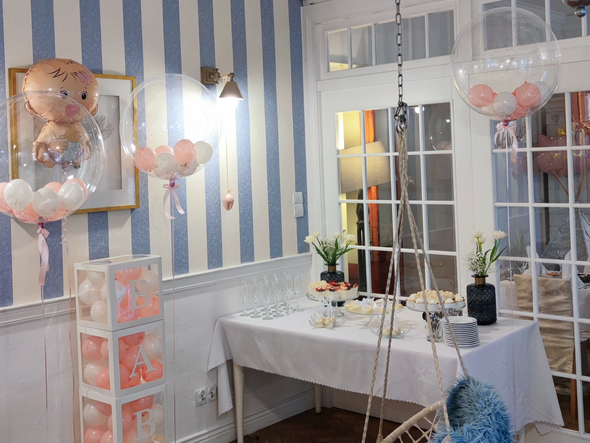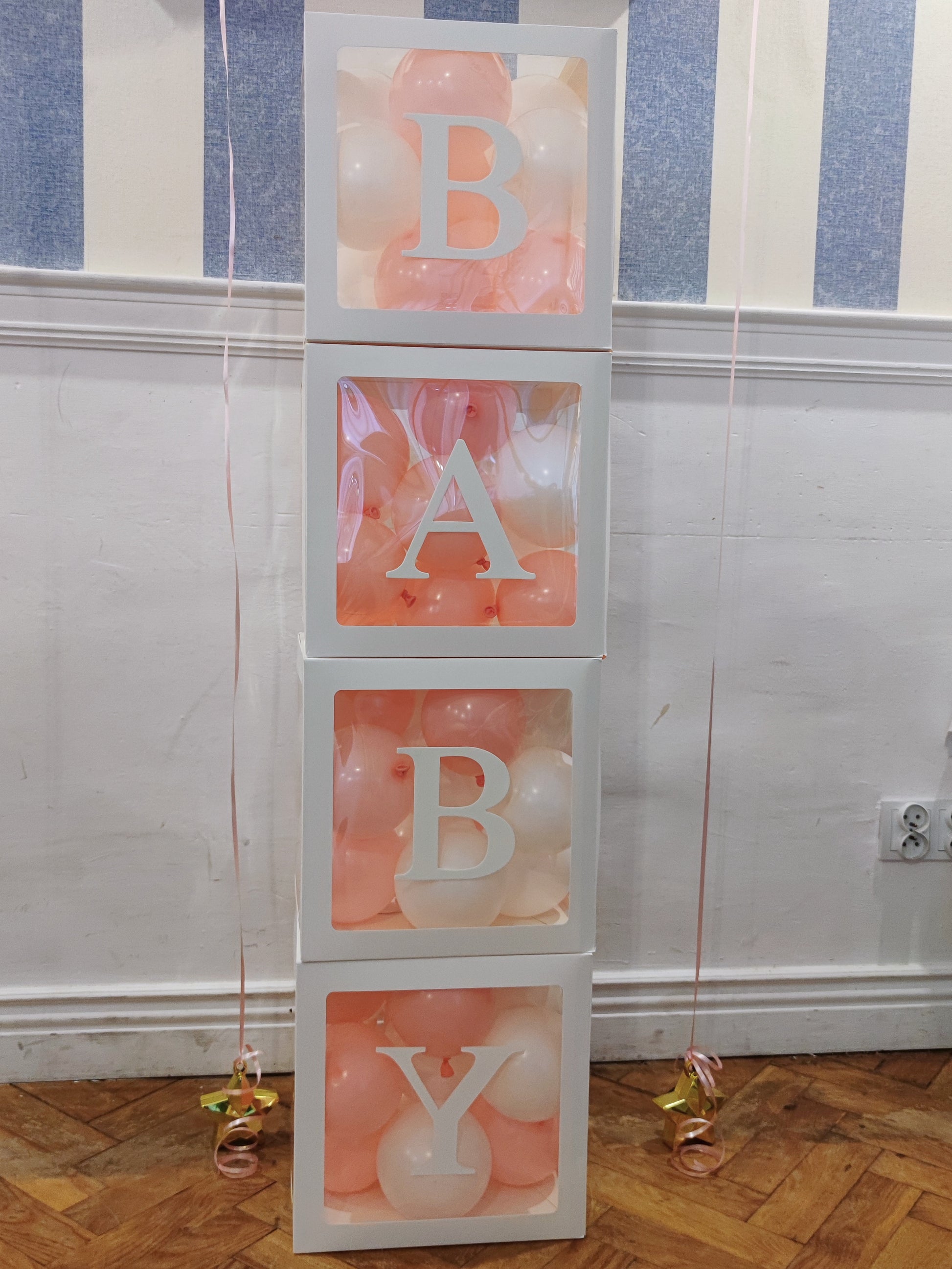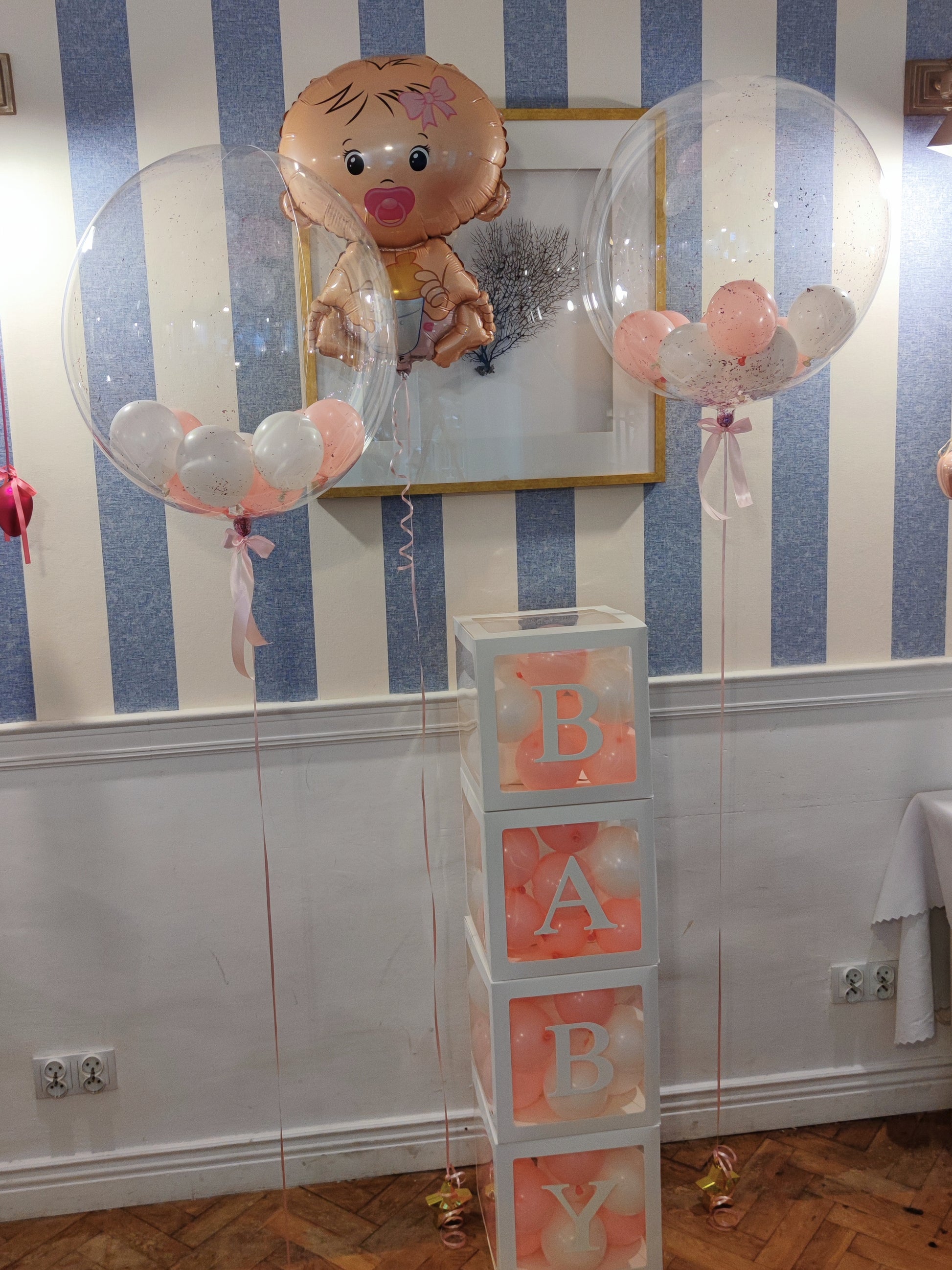 - pudełka transparentne z napisem "BABY" wypełnione różowymi i białymi balonikami .