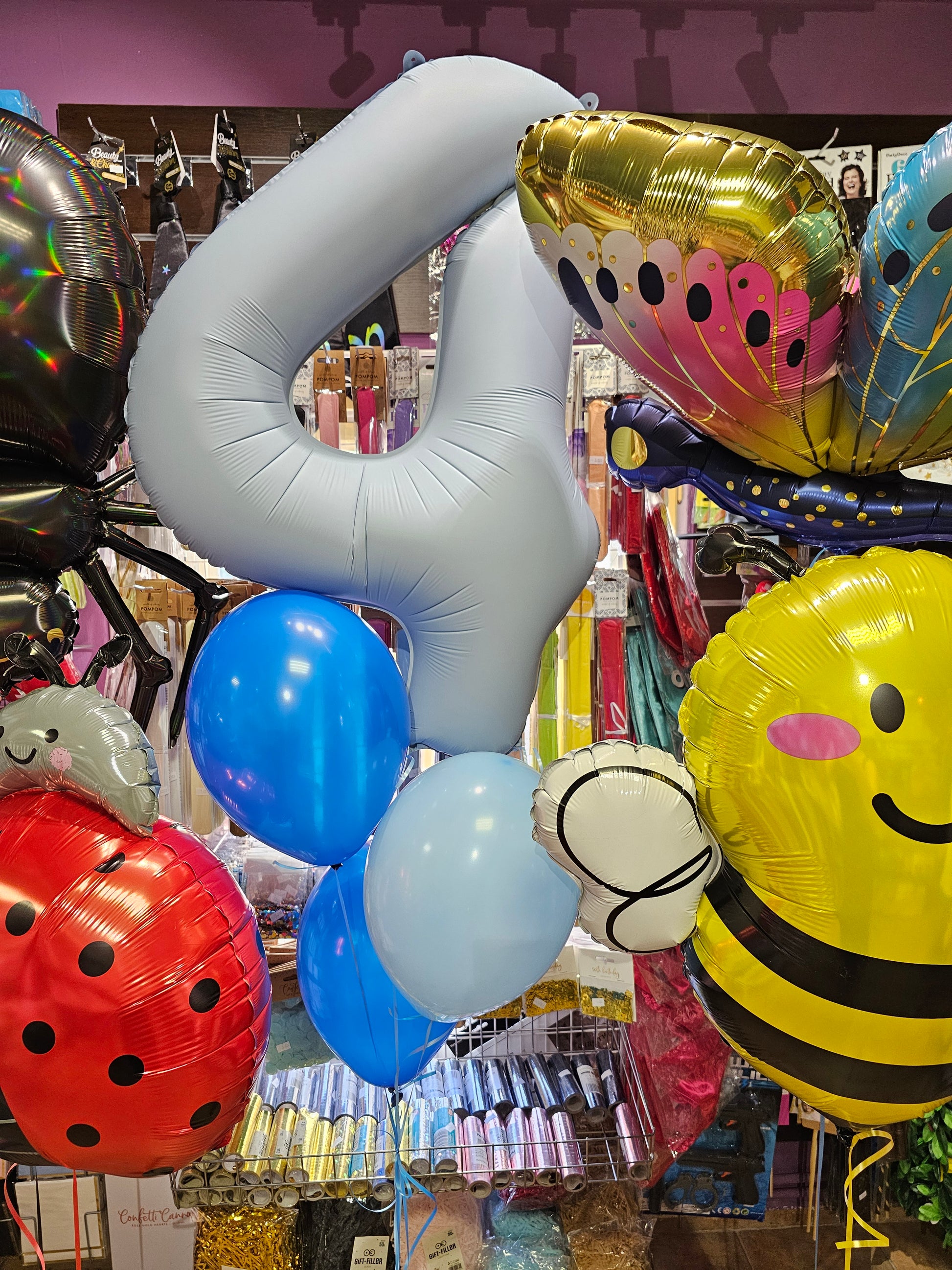 - balon foliowy w kształcie cyfry w kolorze jasnoniebieskim,