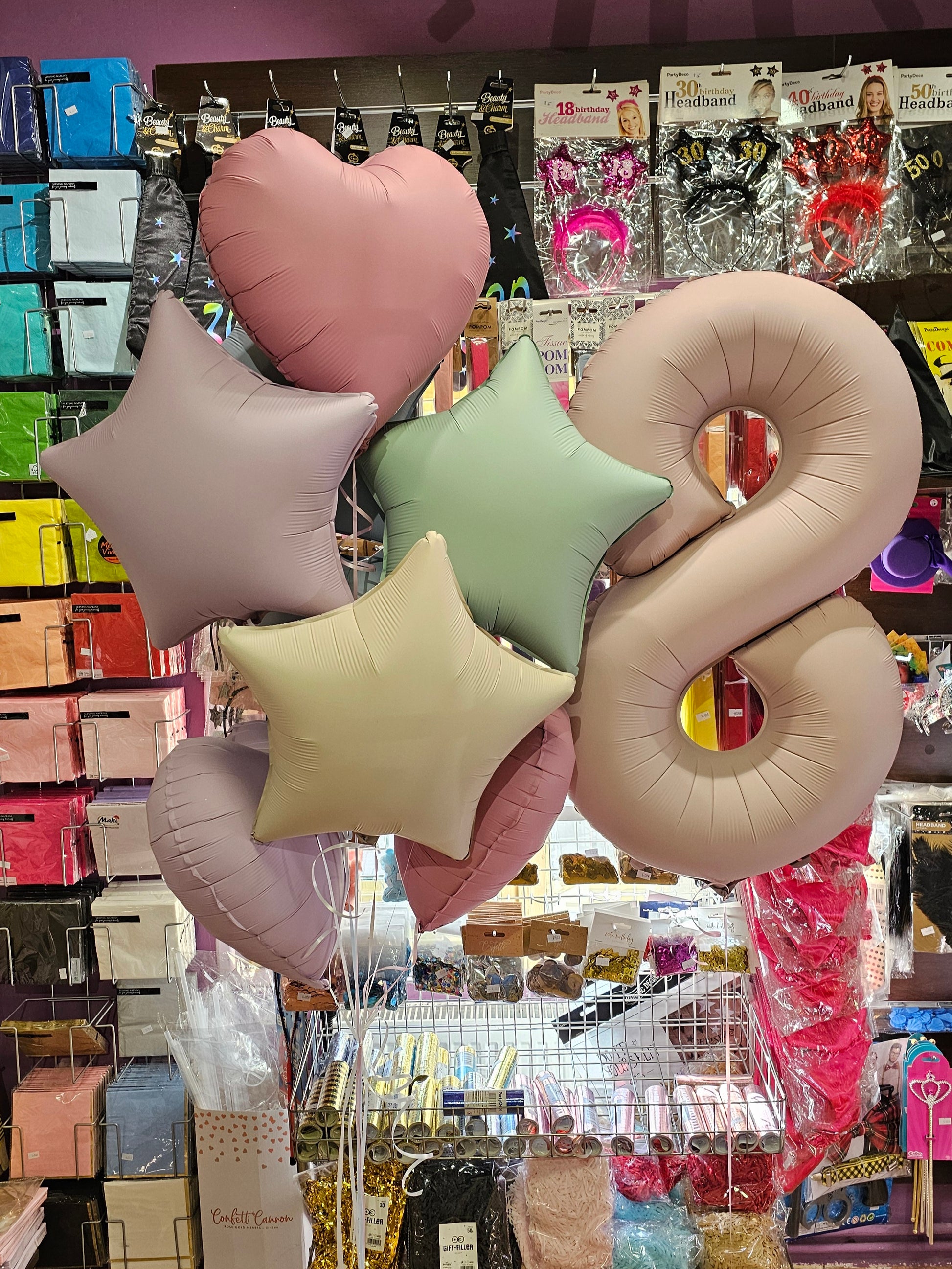 - bukiet z 6 balonów foliowych: 3 gwiazdki 18", 3 serca 18".