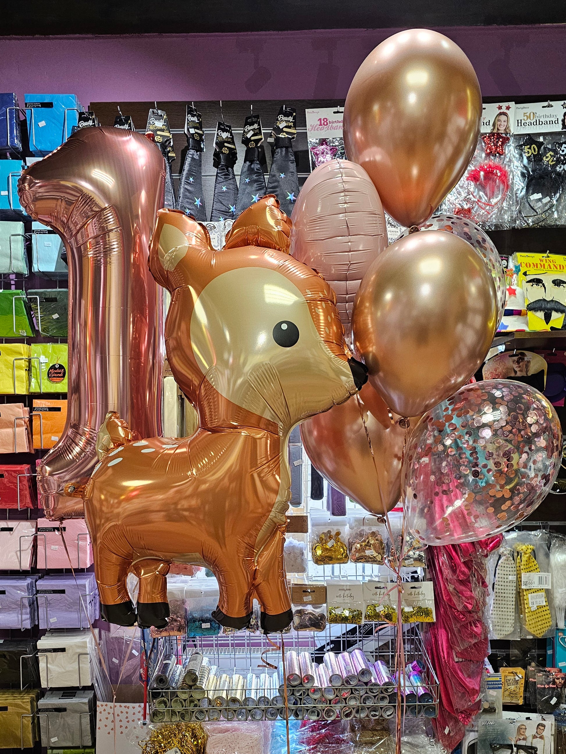 - balon w kolorze różowego złota w kształcie cyfry,